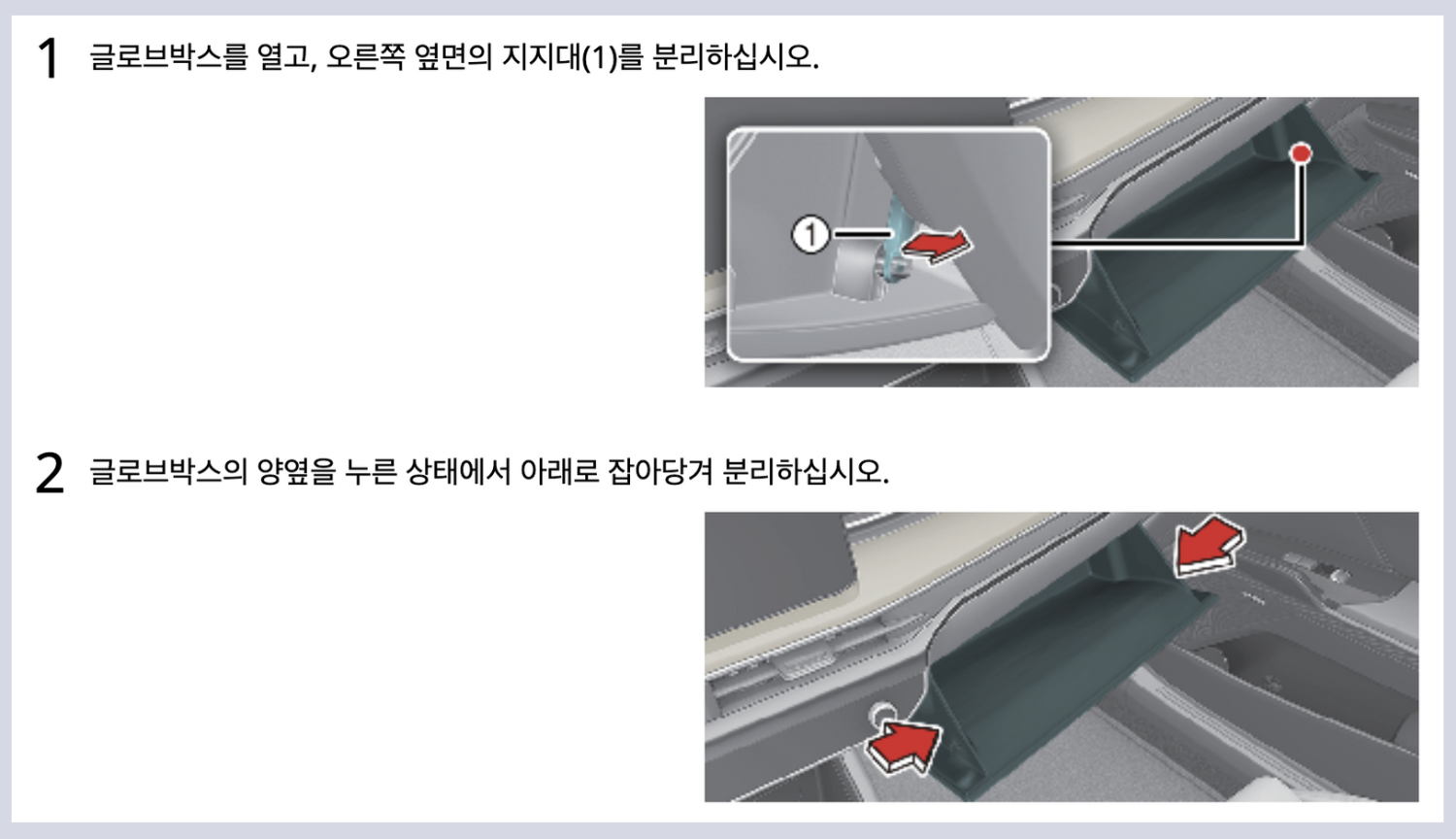 - 글로브박스의 양옆을 누른 상태에서 아래로 잡아당겨 분리하세요.