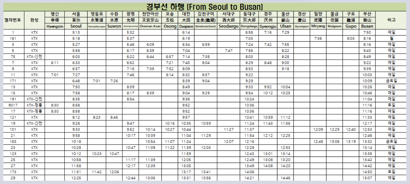 경부선 및 KTX 열차 시간 모두 확인 가능합니다.