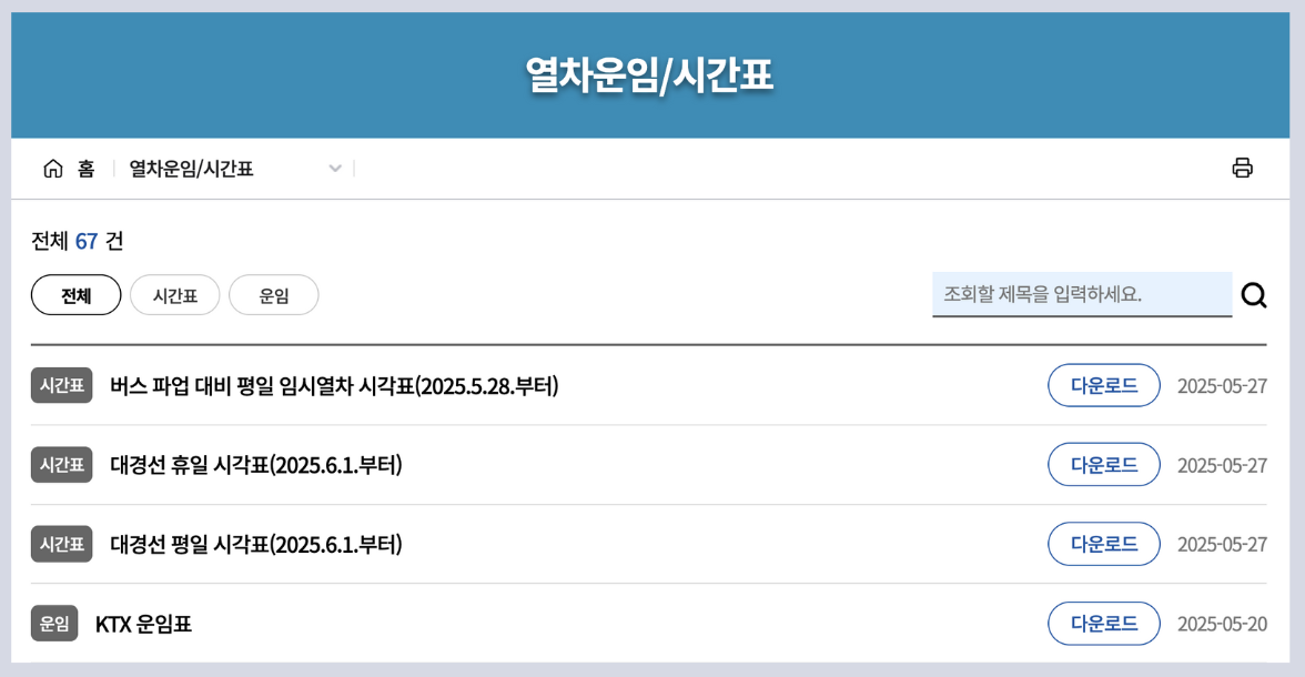 두 번째는 KTX 홈페이지에서 KTX 시간표를 다운로드하는 것입니다.