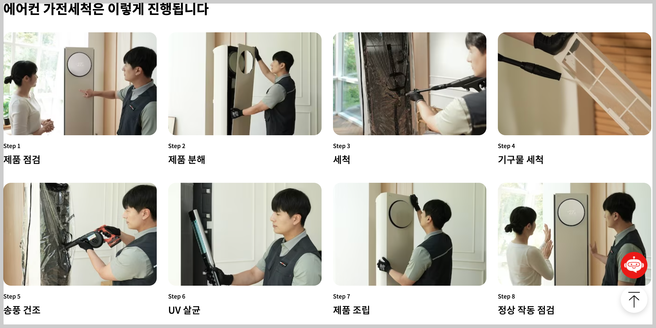 A. LG 제품 구조를 정확히 아는 전담 기술자가 방문, 정품 부품 사용, UV 살균까지 포함되어 신뢰도와 완성도가 높아요.