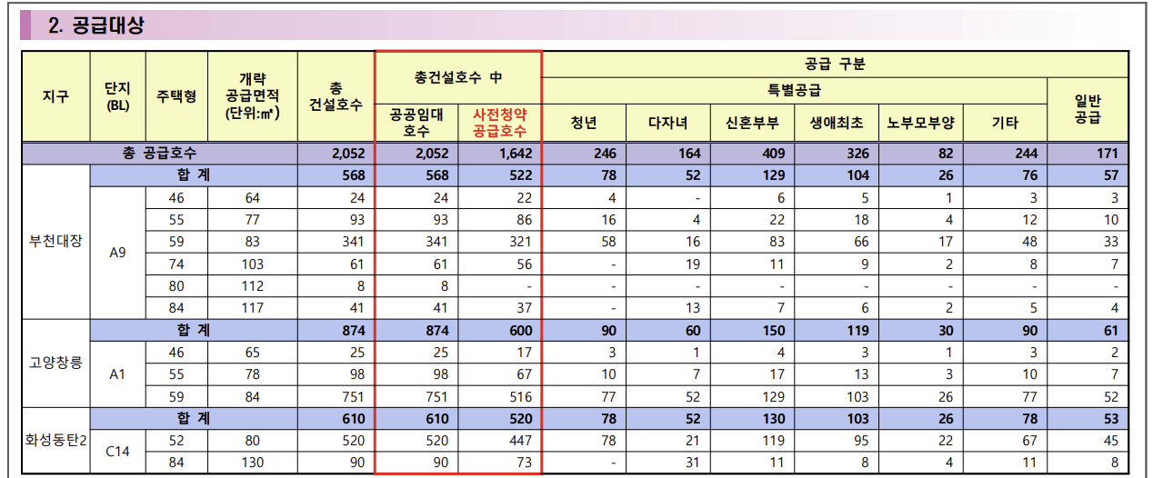 - 특별공급: 청년, 다자녀, 신혼부부, 생애최초, 노부모부양